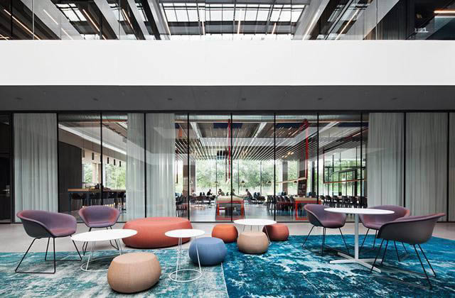 開放式布局是設計的基本,在AEB協作交流是工作方法和思維方式的重要組成部分。這一點顯而易見:一進入接待區,開敞的空間讓視線一覽無余,繽紛的座椅吸引著人們的目光穿過開敞通透的玻璃隔墻進入員工食堂,戶外優美的景觀成為最美的空間背景。